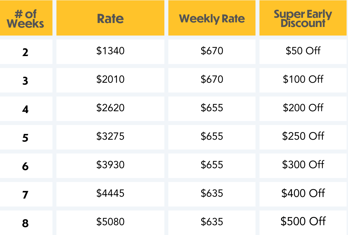 Registration for any number of weeks requires a registration deposit of $500 which goes towards the total balance.